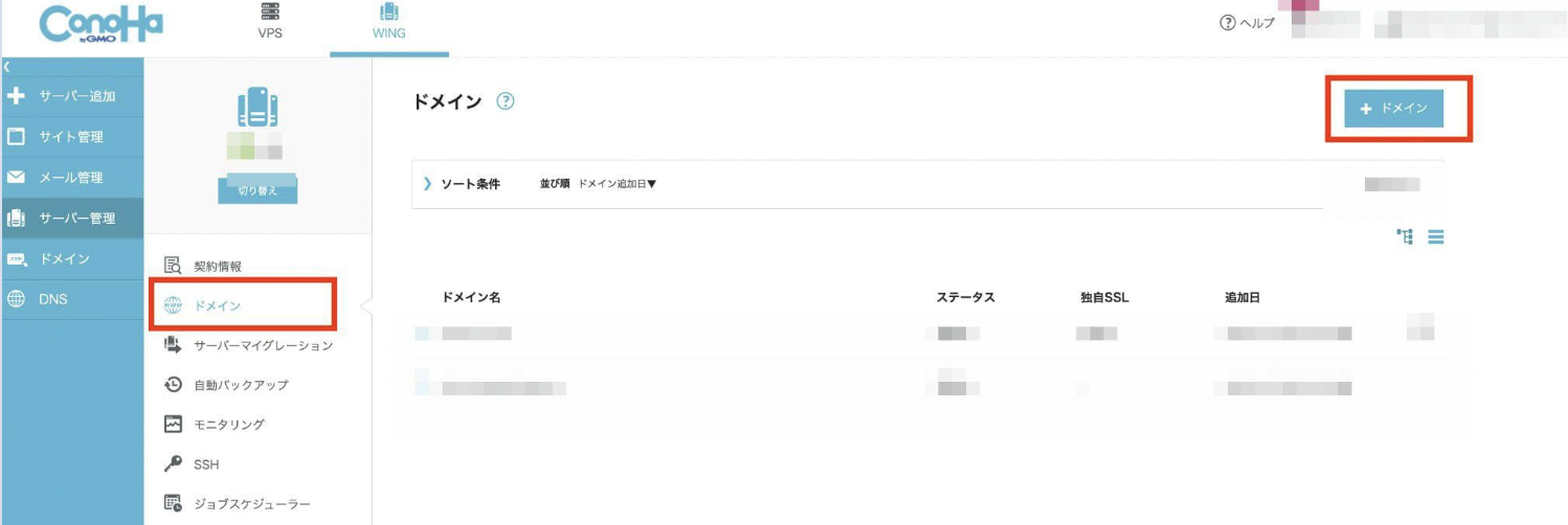 右上に「+ドメイン」ボタンがあるので、押しましょう。