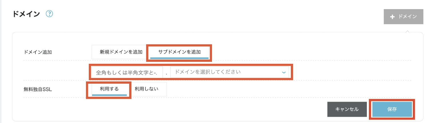 次の項目では、サブドメイン名の入力と、プルダウンから本体ドメインの選択をおこないます。